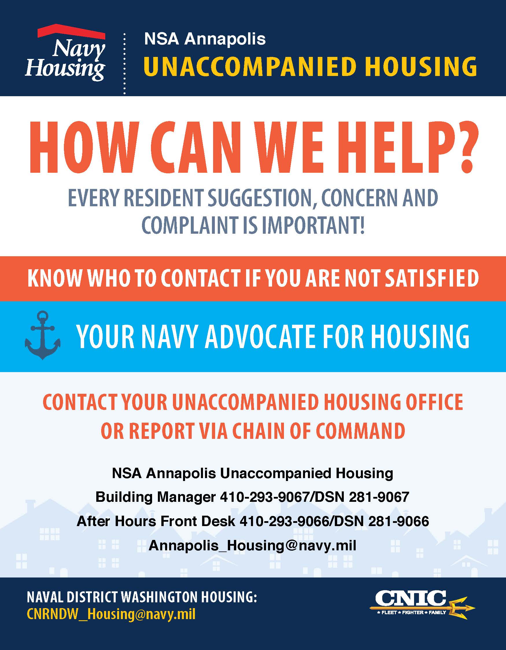 Unaccompanied Housing has 109 rooms for permanent party E-4 and below at Reina Mercedes (Bldg. 47) and Fuller Hall (Bldg. 46)*. Upon receipt of orders to NAS Annapolis, contact Unaccompanied Housing with your arrival date or have your sponsor contact us.