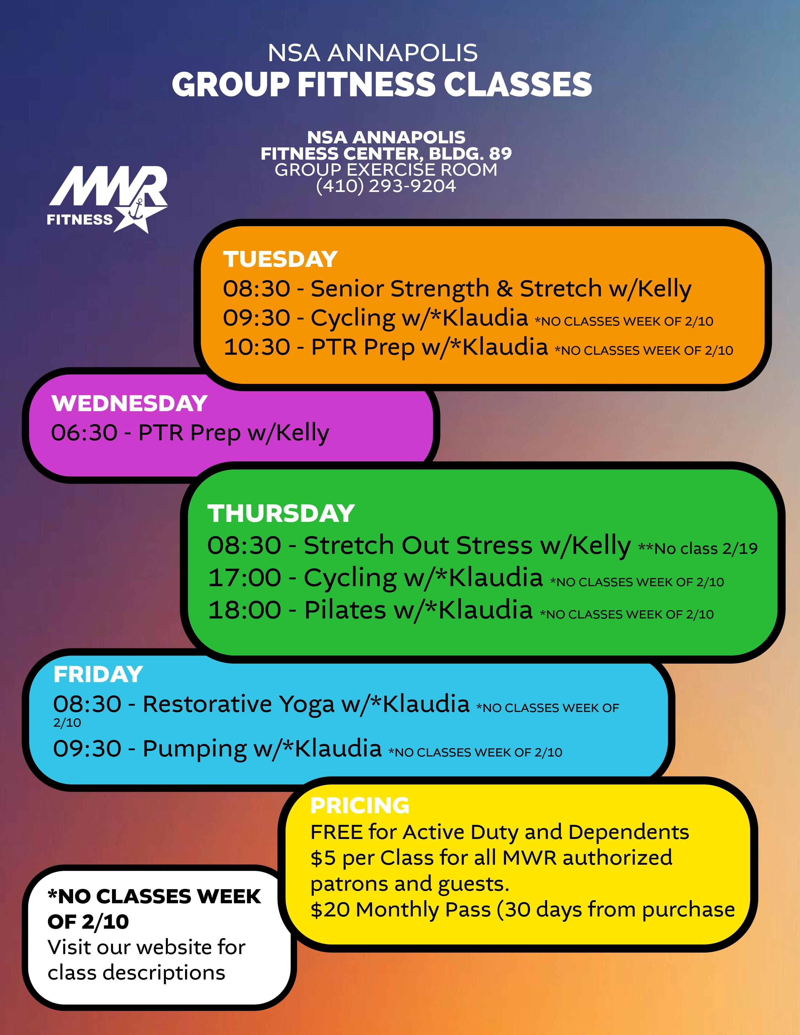 The MWR Annapolis Fitness Center includes a basketball gym; free weight, circuit strength training and cardiovascular rooms; racquetball court, cyle room, a functional fitness room, group exercise classes as announced, and an intramural sports program.